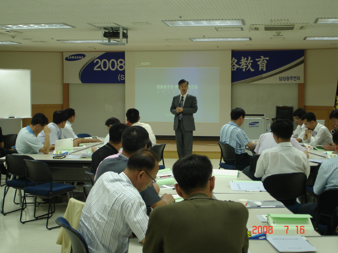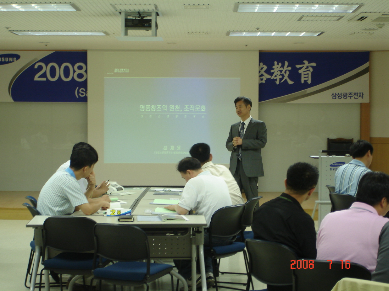 1. 제목 삼성광주전자(주) 2008년도 승격교육 [특강] "명품창조의 원천과 조직문화" 2. 대상 2008년도 신임승진 부, 차장(45명) 3. 일시 및 장소 2008. 7.16(수) 10:00~12:00(2H) 삼성광주전자 한마음프라자 302호 4. 강사 최재윤(크로스경영연구소 대표이사/Ph.D)