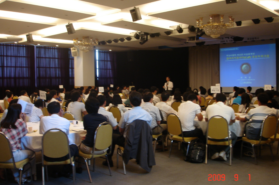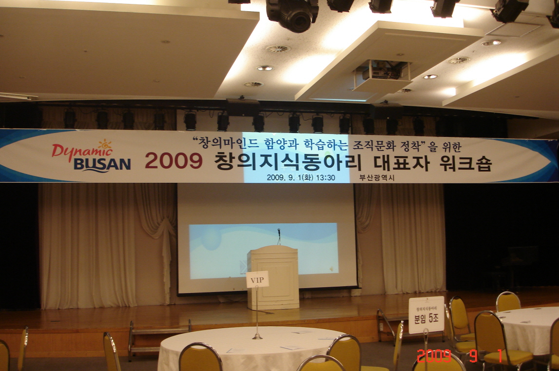 1. 제목 [2009 부산시-창의지식동아리] 창의지식동아리 대표자 학습동아리 워크숍 - 창의마인드 함양과 학습하는 조직문화 정착을 위한 창의지식 동아리 (새로운 비상을 위한 학습조직화) 2. 참가자 창의지식동아리 대표자 및 회원 129명 3. 일시 및 장소 1차수(2009.09.01) / 부산유스호스텔 아르피나(2층) 그랜드볼룸 4. 강사 최재윤 박사 정문희 전임연구원 정아롬 전임연구원