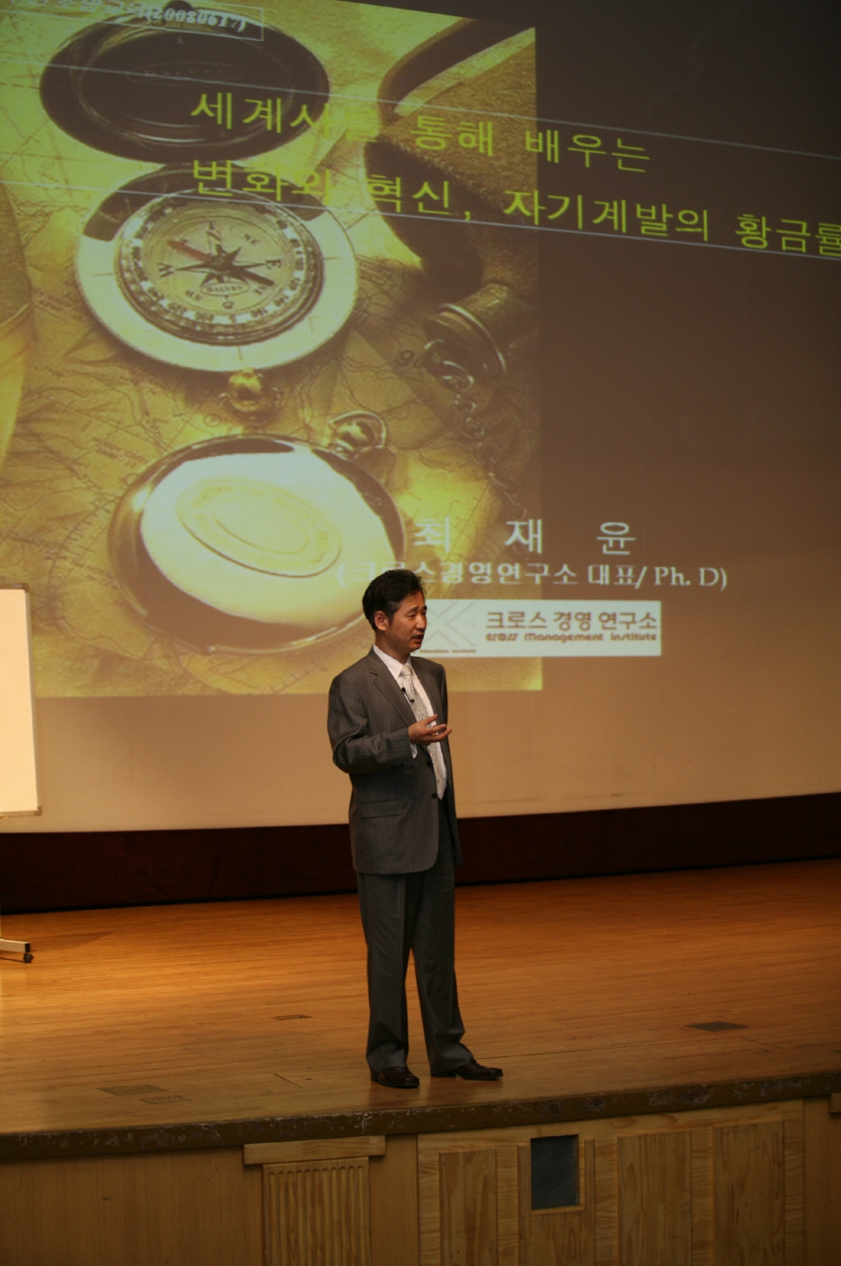 1. 행사명 은평구청 2/4분기 직원 정례조례 및 소양교육[특강] 2. 교육명 세계사를 통해 배우는 변화와 혁신, 자기계발의 황금률 찾기 3. 참가자 은평구청장 및 은평구청 전 공무원(총 300명) 4. 일시 및 장소 2008.6.17(화) / 은평문화예술회관 공연장 5. 강사 최재윤 박사(크로스경영연구소 대표이사/Ph.D)