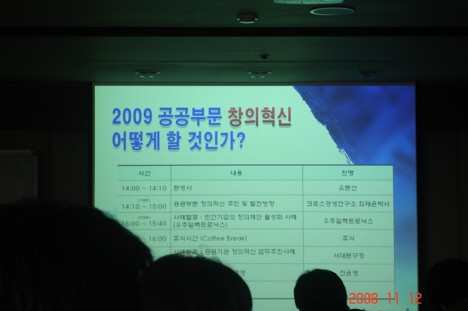1. 제목 (주) 다모넷 주관, 2009 공공부문 창의혁신 세미나 - 창의혁신 특강 2. 내용 공공부문 창의혁신 추진 및 발전방향 - 공공부문의 창의혁신 현주소와 지향 방향 3. 참가자 지자체(시, 군, 구청), 공기업, 중앙정부기관 혁신부서 담당자 4. 일시 및 장소 2008.11.12/ 한국소프트웨어진흥원 세미나실 5. 강사 최재윤 박사(크로스경영연구소 대표이사/Ph.D)