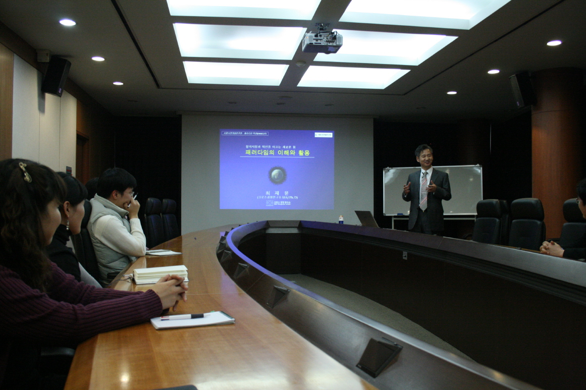1. 제목 [서울시정개발연구원- 특강] 창의시정과 혁신을 이끄는 새로운 힘, 패러다임의 이해와 활용 2. 대상 서울시정개발연구원 기획조정실 및 산학연지원센터 행정직 3. 일시 및 장소 2008. 12.17/ 서울시정개발연구원 중회의실 4. 강의 최재윤 박사(크로스경영연구소 대표이사) http://news.sdi.re.kr/newshome/mtnmain.php?eda=&sda=&sid=17&stext=&mtnkey=articleview&mkey=dsearchlist&mkey2=17&aid=187