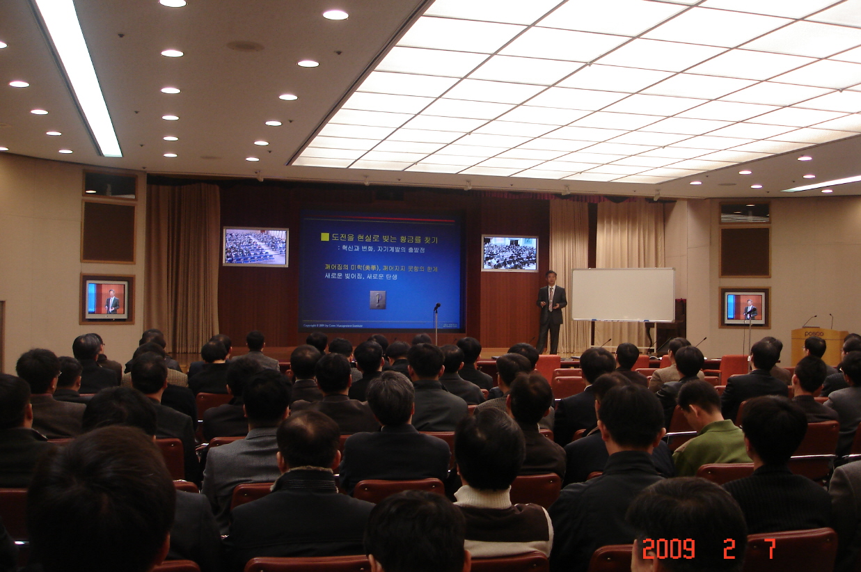 1. 제목 POSCO 팀리더 월례학습 특강 "도전추구를 위한 우리의 변화와 혁신" 2. 대상 포스코(POSCO) 과공장장, 팀리더 650명 (포항 244명, 광양 169명, 서울 192명) 3. 일시 및 장소 2009.2.7 8:30~10:00/ 광양제철소 이노베이션 센터 7층 대강당 (서울/포항 동시중계) 4. 강사 최재윤 박사(크로스경영연구소 대표이사/Ph.D)